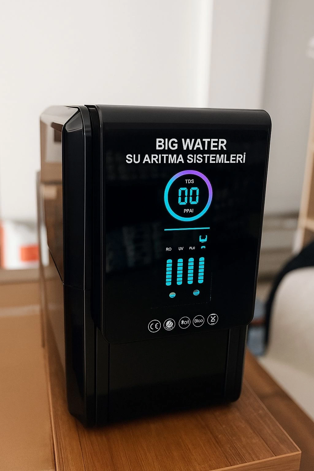 Big Water Dijital Su Arıtma Cihazı, modern tasarımı ve akıllı teknolojisiyle evinizin su kalitesini en üst seviyeye taşır. 6 aşamalı filtrasyon sistemi sayesinde suyunuzdan kireç, klor, ağır metal ve kötü kokuları tamamen arındırır. Ön panelde yer alan dijital ekran ile suyun durumu ve filtre ömrü kolayca takip edilebilir.